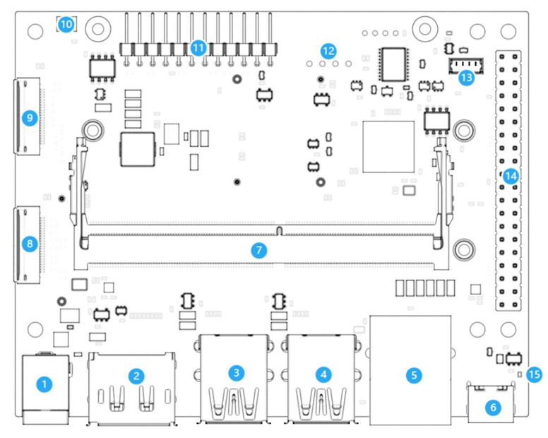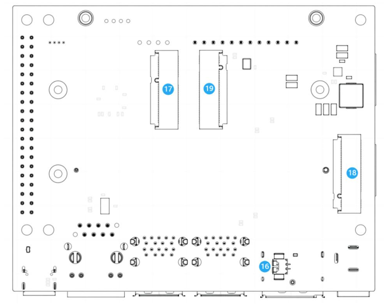 Expansion Header (14): The 40-pin GPIO header provides a 5V output rail with reverse current protection. It supports a maximum current of 0.8A and is safeguarded by over-current protection (OCP), which automatically disables the output upon detecting a fault. Actual performance depends on the specific system-on-module (SOM) in use. Please refer to the specifications below.
